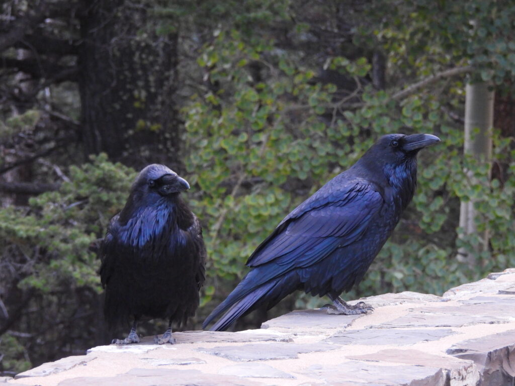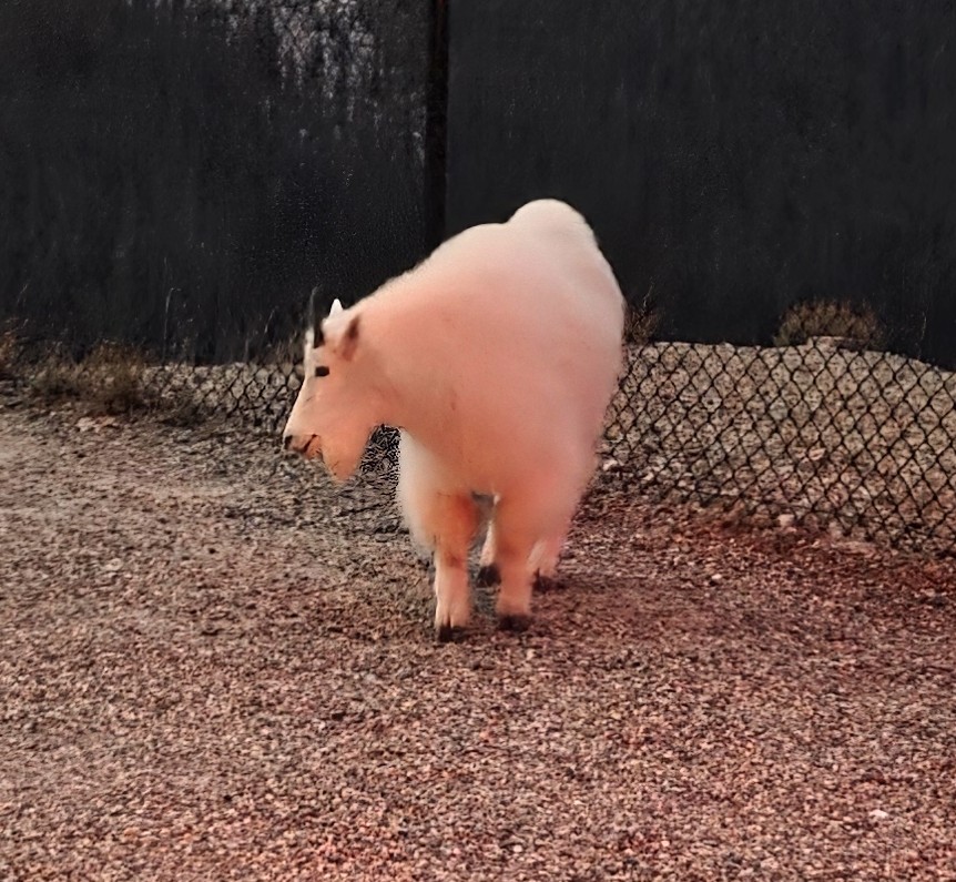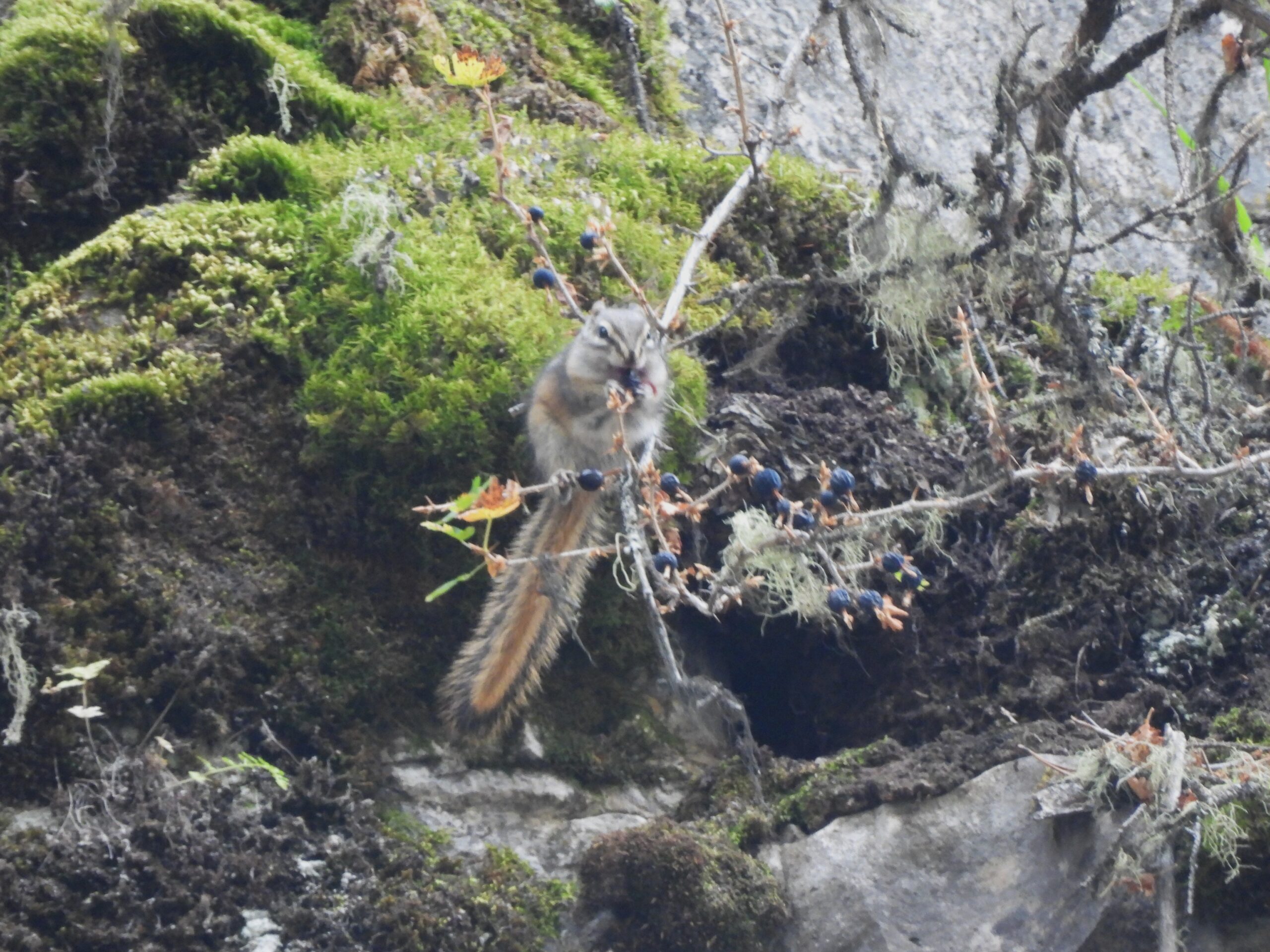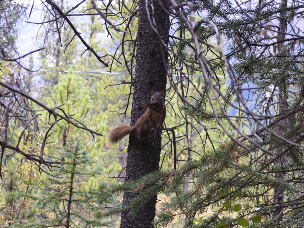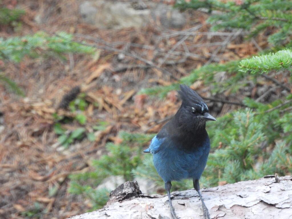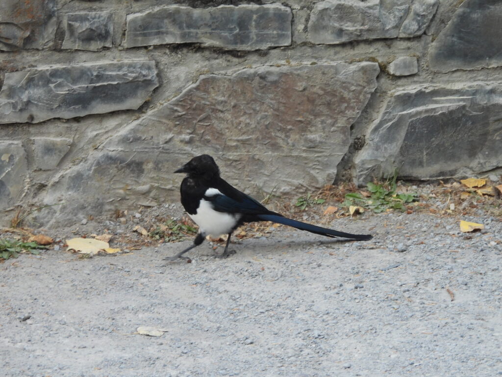 One of the “target” animals I really wanted see were Mountain Goats. These white, nomadic animals are usually found high on cliffs, rarely coming down in the warmer months. At each stop we made, I would scan the cliffs and high mountain meadows to see if I could pick out a few, moving “white rocks.” I got a lot of curious looks from other people when I would stand with my back to a popular waterfall attraction (not looking at it) with binoculars up to my eyes looking above all their heads! At one pull-off I finally found a few, but they were miles away, barely visible even with my binoculars. Then, early one morning as we drove back south along the Icefields Parkway, we came around a corner and suddenly I noticed this large white blob standing right in the gravel shoulder of the highway, next to a fenced off area. It was a large male Mountain Goat, most likely licking salt off the side of the road. I slammed on the brakes, almost propelling Theresa through the windshield to the valley below. I hollered at her that there was a Mountain Goat right outside her window! She had just enough time to roll down her window and snap a few pics with her cell phone, as the cool-looking goat, turned, showed us his butt, and proceeded to drop down over the steep edge. It was a quick encounter, but awesome to see! We also saw a few birds, including Black-billed Magpies, Stellar’s Jay, Canada Jay, Clarke’s Nutcracker and a Golden Eagle being harassed by Common Ravens.