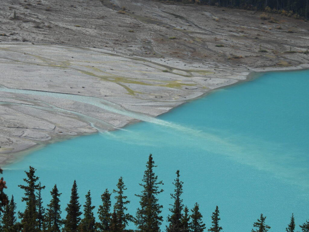 These beautiful turquoise lakes are fed by rivers where large, active glaciers are pushing through rocky valleys upstream. The glaciers function like bulldozers, grinding away and pulverizing rocks along valley floors and walls. The process produces a fine-grained powder of silt and clay, called glacial flour, that is picked up by meltwater streams. Since the particles are so fine, they are slow to sink to the bottom, remaining suspended in the water column instead.