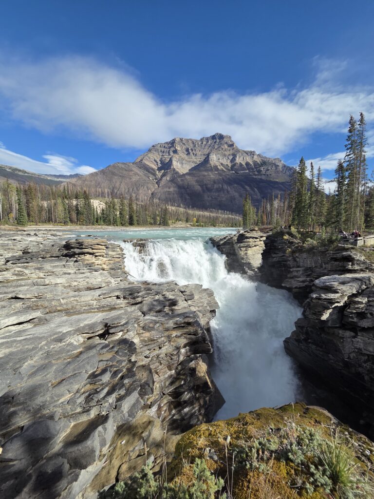 When sunlight hits the water, these particles absorb the shortest wavelengths: the purples and indigos. Meanwhile, the water absorbs the longer wavelength reds, oranges, and yellows. That leaves mainly blues and greens to get scattered back to our eyes. Even as we stood there staring at them and snapping photos, they didn’t look real! And of course, wherever you have tall mountains with melting glacier streams, you’ll have roaring, powerful waterfalls in the valleys below, and both parks have plenty of them, right along the parkway.