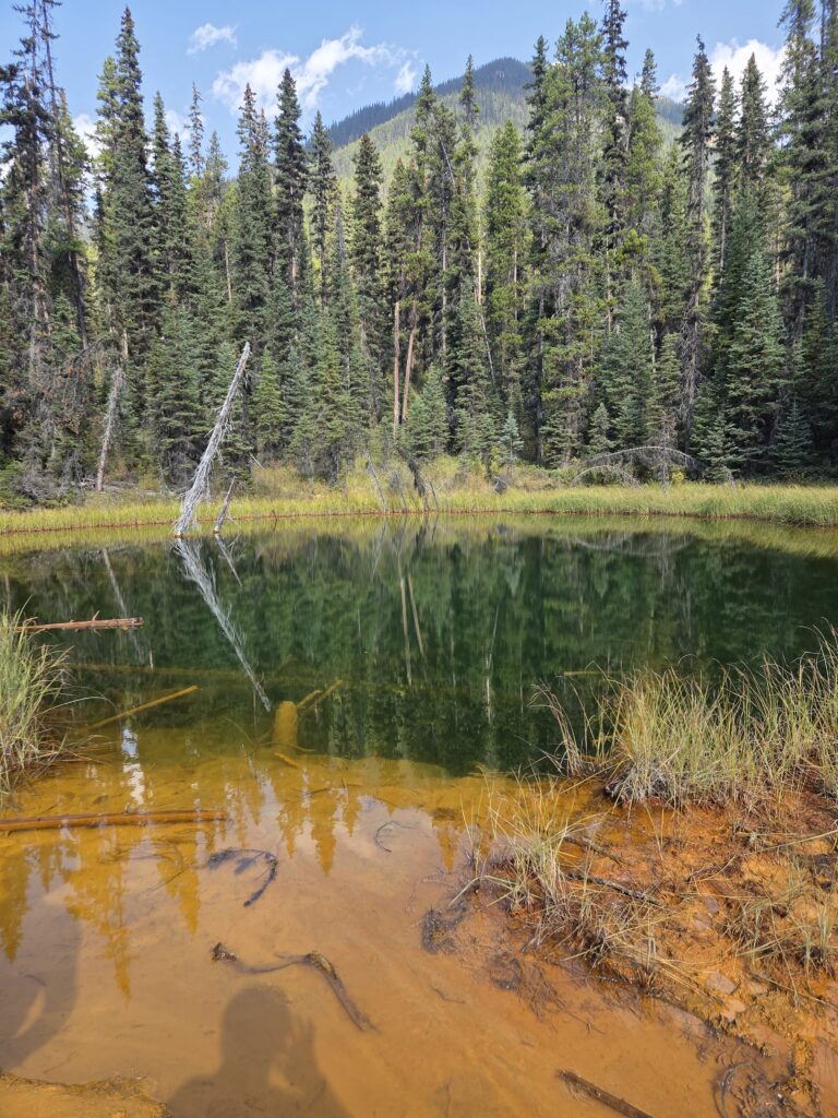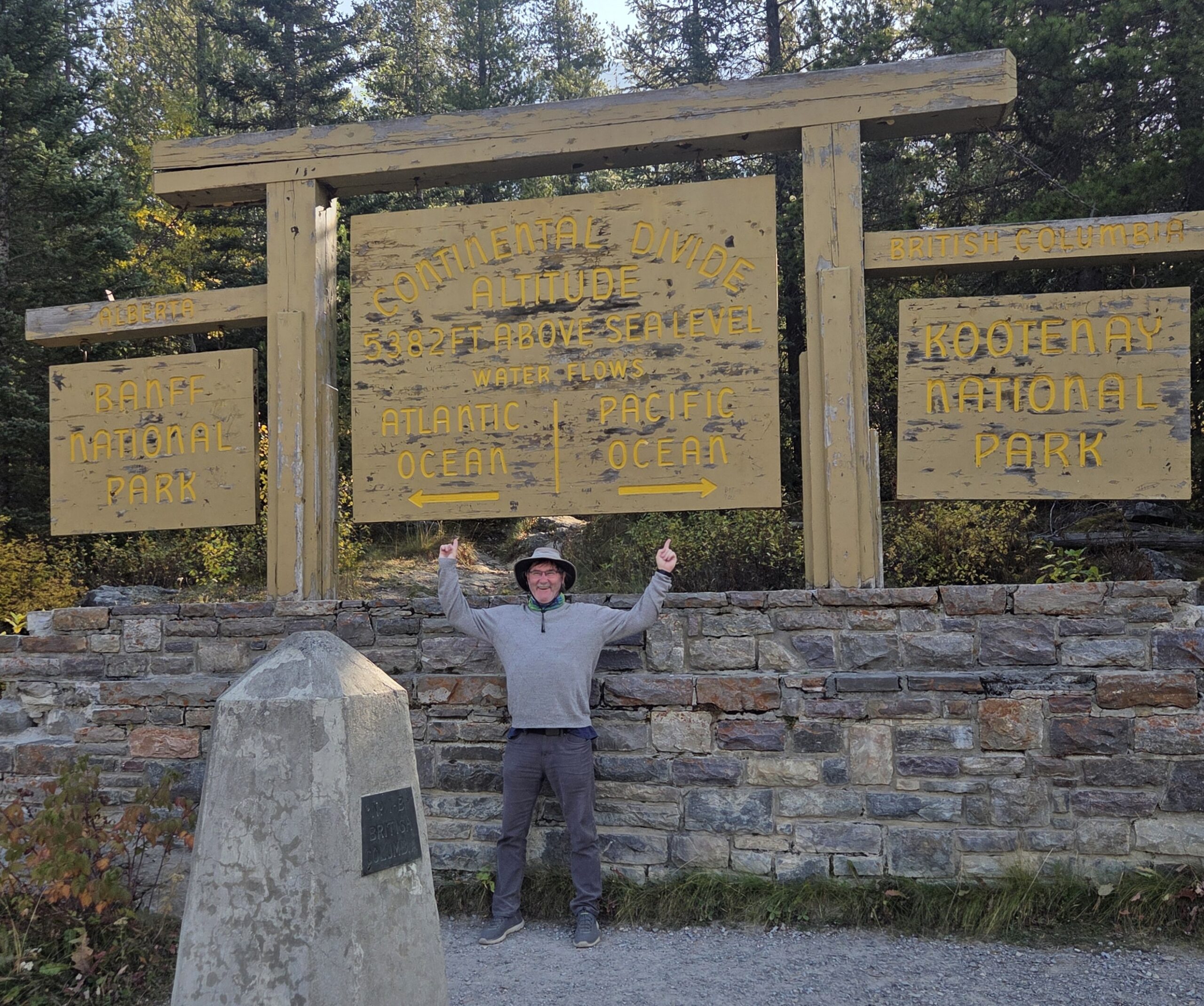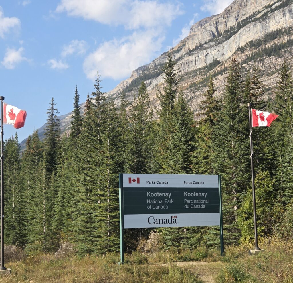 We ended our trek through the Canadian Rockies with a visit to our fourth national park in 7 days, Kootenay National Park. Again, this is a smaller, less visited park than the “big two,” but still had towering mountains, rushing waterfalls and miles of hiking trails. One of the coolest stops we made was at a famous little roadside pull-off. That exact spot was not only the border between Yoho National Park and Kootenay National Park, but it was also the border between the Province of Alberta and the Province of British Columbia. But the most impressive fact about that location was that it was the actual Continental Divide, where all water flowing from my right eventually flowed into the Atlantic Ocean, and all water flowing from my left eventually flowed into the Pacific Ocean! As a note, I did walk behind the wall and the sign, but found no water at all! But how cool is that!